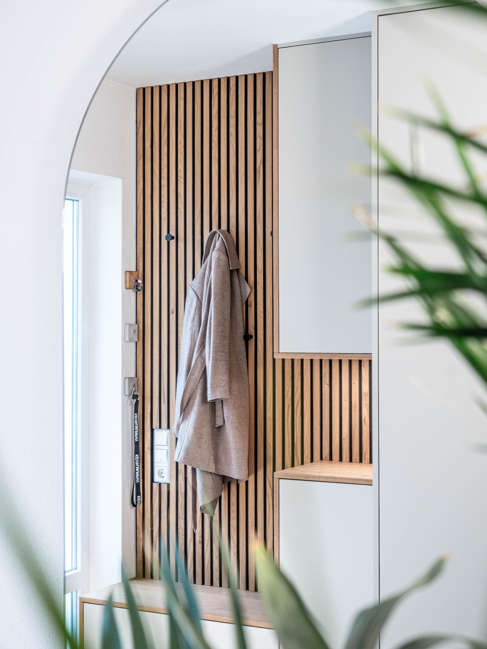 Warme houten fronten, zwarte panelen en een nauwkeurig geïntegreerde zitbank voor een rustige, luxueuze entree.