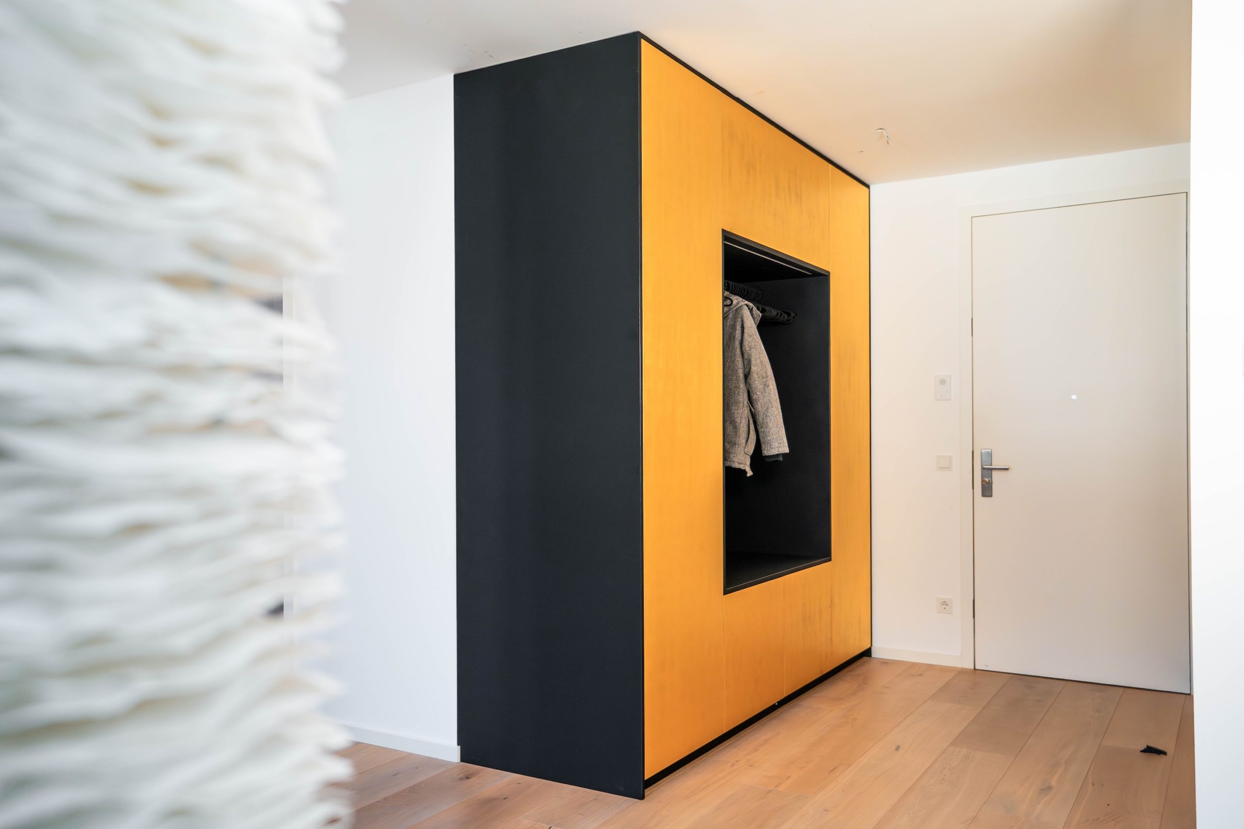 Stijlvol: de garderobekast past harmonieus in het oude gebouw en creëert een stijlvolle en uitnodigende sfeer in de entree.