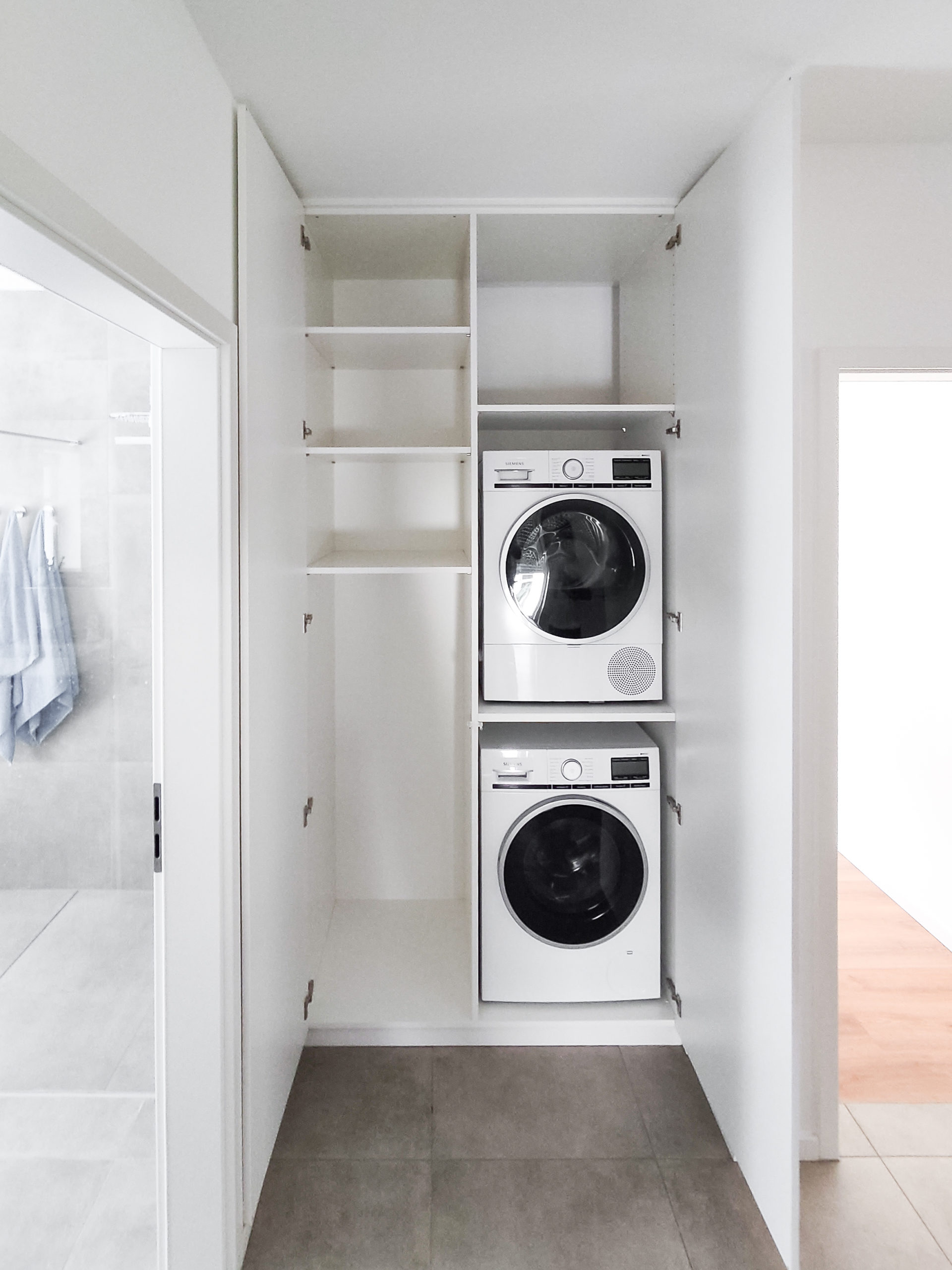 Auch im Badezimmer kann ein Trocknerschrank eine sinnvolle Ergänzung sein, besonders in Wohnungen ohne separaten Hauswirtschaftsraum. Mit Glastüren kann er modern wirken und den Trockner elegant integrieren.